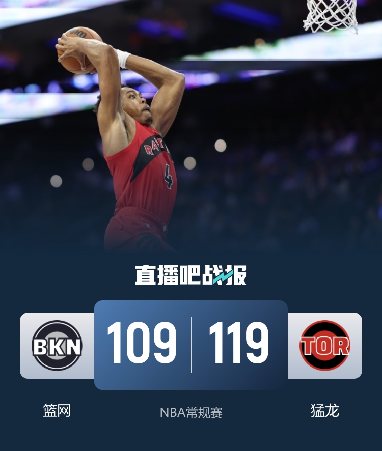 比赛上来,猛龙就迅速进入状态打出12-0的完美开局,首节过去三分钟篮网才由克洛尼突破打破僵局,调整过后的篮网利用一波14-2的攻势一度抹平分差,不过他们并没能完成反超,猛龙在次节先拿五分后分差再次来到两位数,半场结束时篮网落后7分;下半场回来,猛龙的命中率出现下滑,巴雷特因膝盖受伤也是提前退赛,篮网一度将分差追到仅剩1分,但这次他们还是没能完成反超,末节双方一直拉锯,比赛悬念保持到了最后,关键时刻篮网突然不得分,猛龙一波8-0直接带走比赛,最终猛龙力克篮网豪取七连胜。