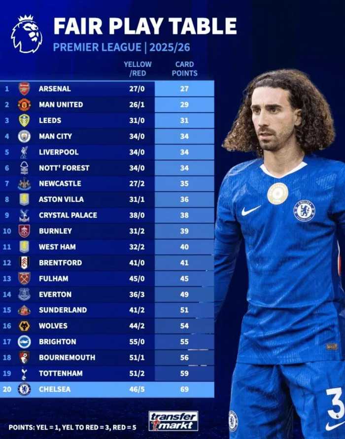 (黄牌:1分;两黄变一红:3分;直接红牌:5分,积分越少说明遭到处罚的次数越少)